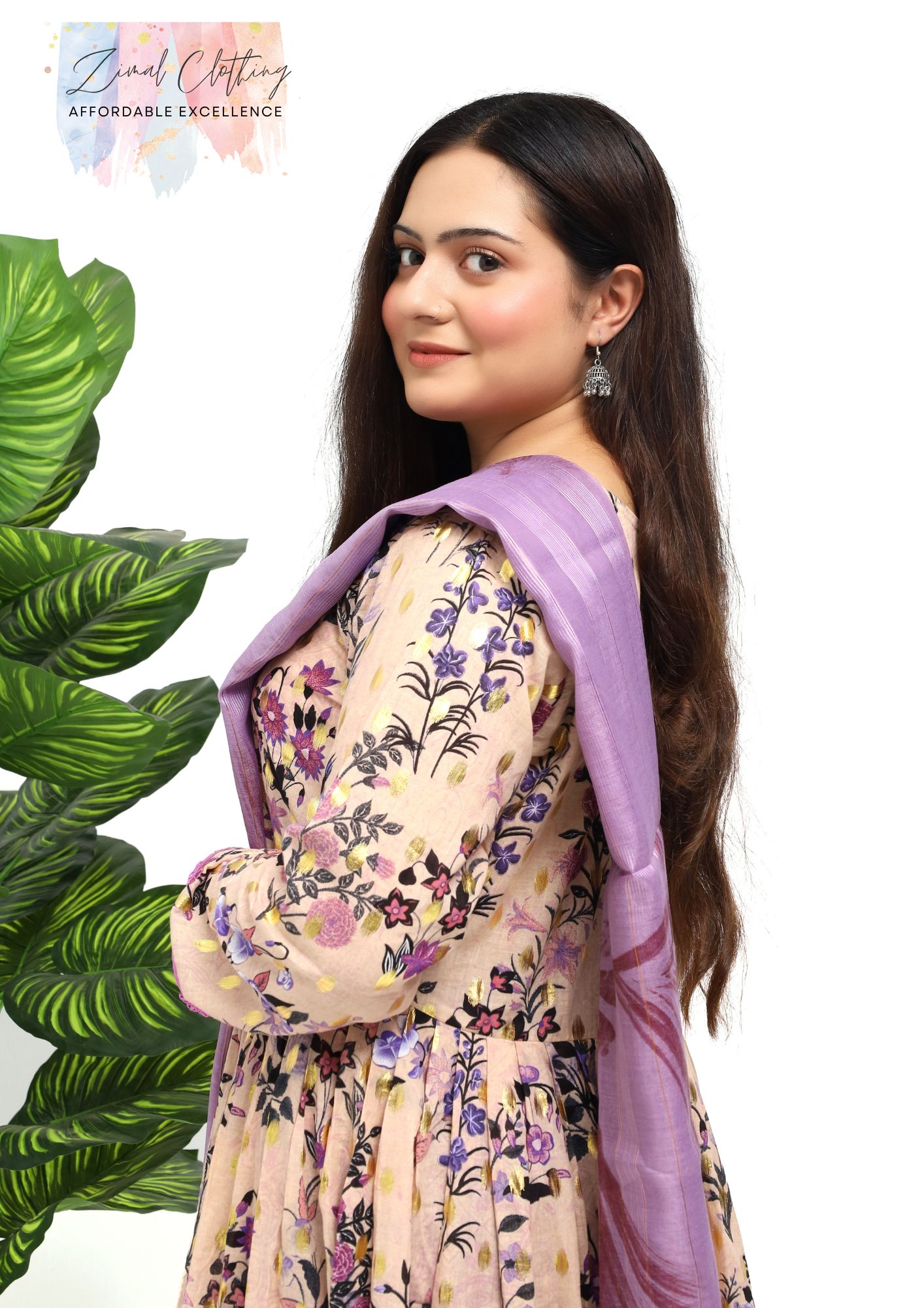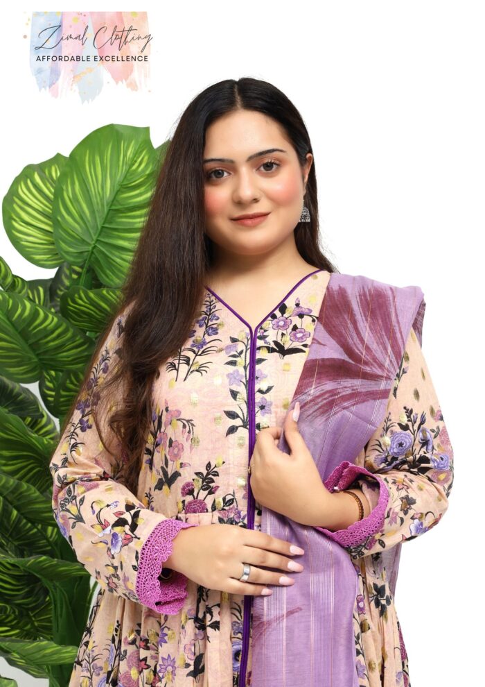 Step into charm and sophistication with Zimal Clothing’s Purple Open Cut Flair Frock with Dupatta, a graceful outfit designed with delicate floral prints in soft pastel hues. Made from premium quality lawn fabric, this frock offers a comfortable, breathable, and stylish design, perfect for casual wear, semi-formal gatherings, and seasonal outfits. Paired with a matching printed chiffon/jacquard dupatta, it creates a timeless look that never goes out of style.