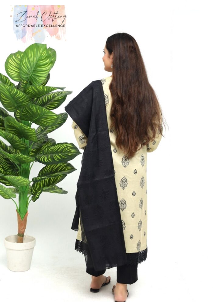 Step into timeless elegance with Zimal Clothing’s Black Beauty Printed Lawn Suit. This stunning 3-piece Pakistani lawn dress features a bold printed lawn shirt, classic lawn trouser, and a beautifully woven jacquard dupatta — making it the perfect outfit for women who love style, grace, and tradition. Ideal for both casual wear and semi-formal occasions, this suit is a must-have in your wardrobe.