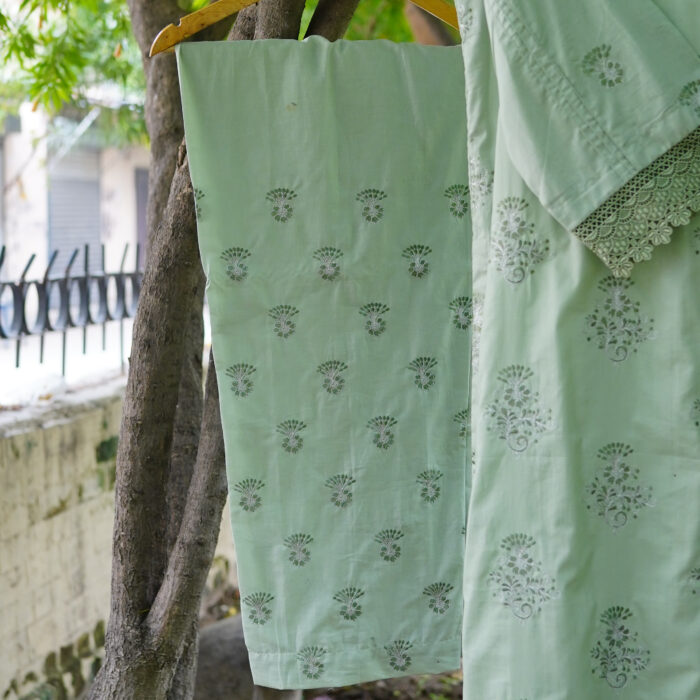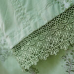 This graceful 3-piece suit features a green-toned embroidered lawn shirt, beautifully adorned with delicate thread work that adds charm and refinement to your look. The shirt is enhanced with intricate lace detailing on the sleeves and daman, giving it a subtle yet elegant finish.